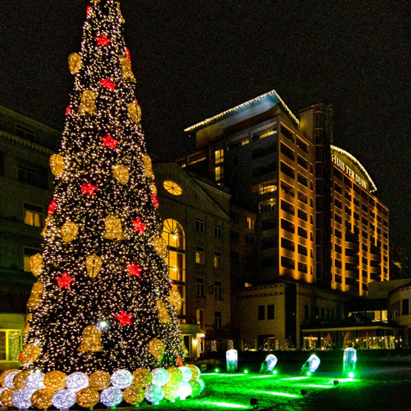 Just a short distance between Amsterdam and The Hague, the Grand Hotel Huis ter Duin (1885) in Noordwijk aan Zee, Netherlands, is a historic seaside retreat that has been offering fantastic views of the North Sea for more than a century. Since 2009, the hotel has celebrated the December holidays with a massive Christmas tree in the hotel garden. At the beginning of the month, the hotel hosts a spectacular tree-lighting ceremony with a different ambassador visiting each year to illuminate the tree. According to tradition, the Christmas Tree Lighting Ambassador is kept secret until the last moment, and, during the ceremony, the anonymous ambassador is called forward to be revealed by the director of Grand Hotel Huis ter Duin. The ambassador takes center stage, pronounces their wishes for the Christmas season, and then presses a big, red button. Brilliance erupts! After a music and light show, the Christmas tree is officially lit, and the Christmas season starts in Grand Hotel Huis ter Duin. Ambassadors are chosen for different reasons at different years, but most of them have a background in sports, politics, cultural influence, or entrepreneurial success. Regular guests and staff families are invited to the ceremony. The tree, which stays up through the first week of January, is a popular place for holiday portraits and family photos throughout the holidays. |