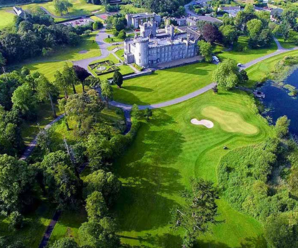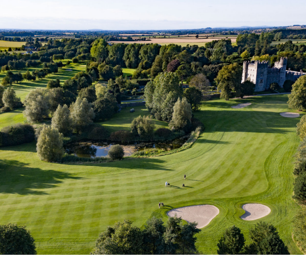 Kilkea Castle in County Kildare, Ireland, blends its historic past with contemporary elegance in a 180-acre setting of a romantic Irish castle, bucolic woodland, formal gardens, and championship golf course. The estate was established in 1180 and was inducted into Historic Hotels Worldwide in 2020. The Kilkea Golf Course (18-hole, par 70) was developed in the 1990s in this magnificent setting, in the shade of the 12th-century castle—the longest continuously inhabited castle in Ireland. It is a parkland course designed by architects Jack McDaid and Jim Cassidy and was designed so that the splendor of the castle can be viewed from every fairway. In constructing this championship course, the designers cleverly used the River Griese as a natural hazard flowing through the castle grounds and estate. The combination of this waterway and a variety of other hazards and interesting greens ensures the golfer playing this 18-hole, par 70 course has a considerable challenge on his or her hands. Players encounter the river at almost every hole. Two lakes have also been included in the course design, adding to the overall difficulty of the challenge of this royal and ancient game. The course’s record was set by Irish professional Damien McGrane, who shot an incredible 64. The Clubhouse at Kilkea Castle overlooks the 9th hole with occasional glimpses of the historic 12th-century castle. |