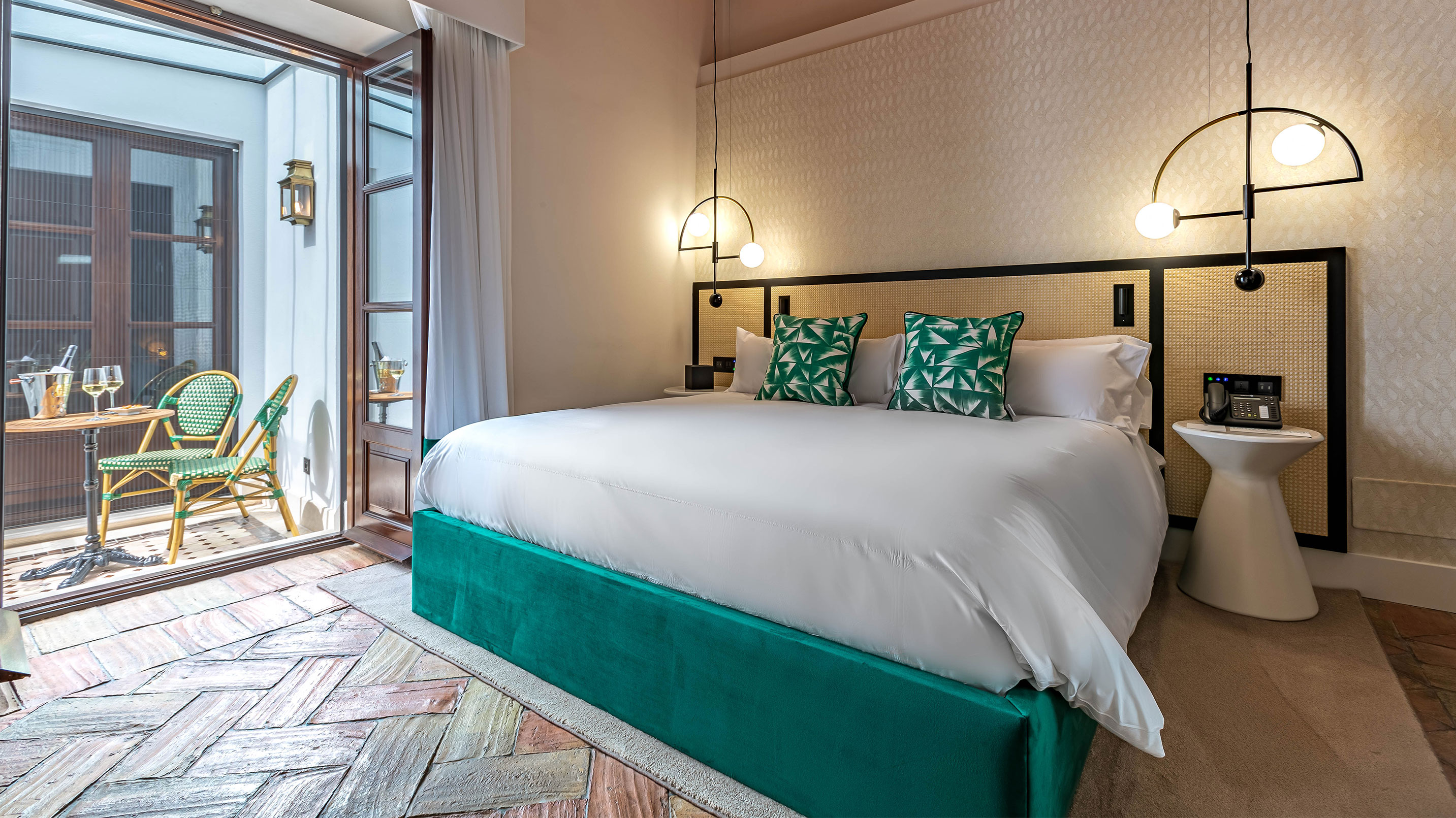 The elegant Zahara Chic guestroom is inspired by the vibrant culture of Cádiz, where flamenco music and sherry wine flood the streets.
