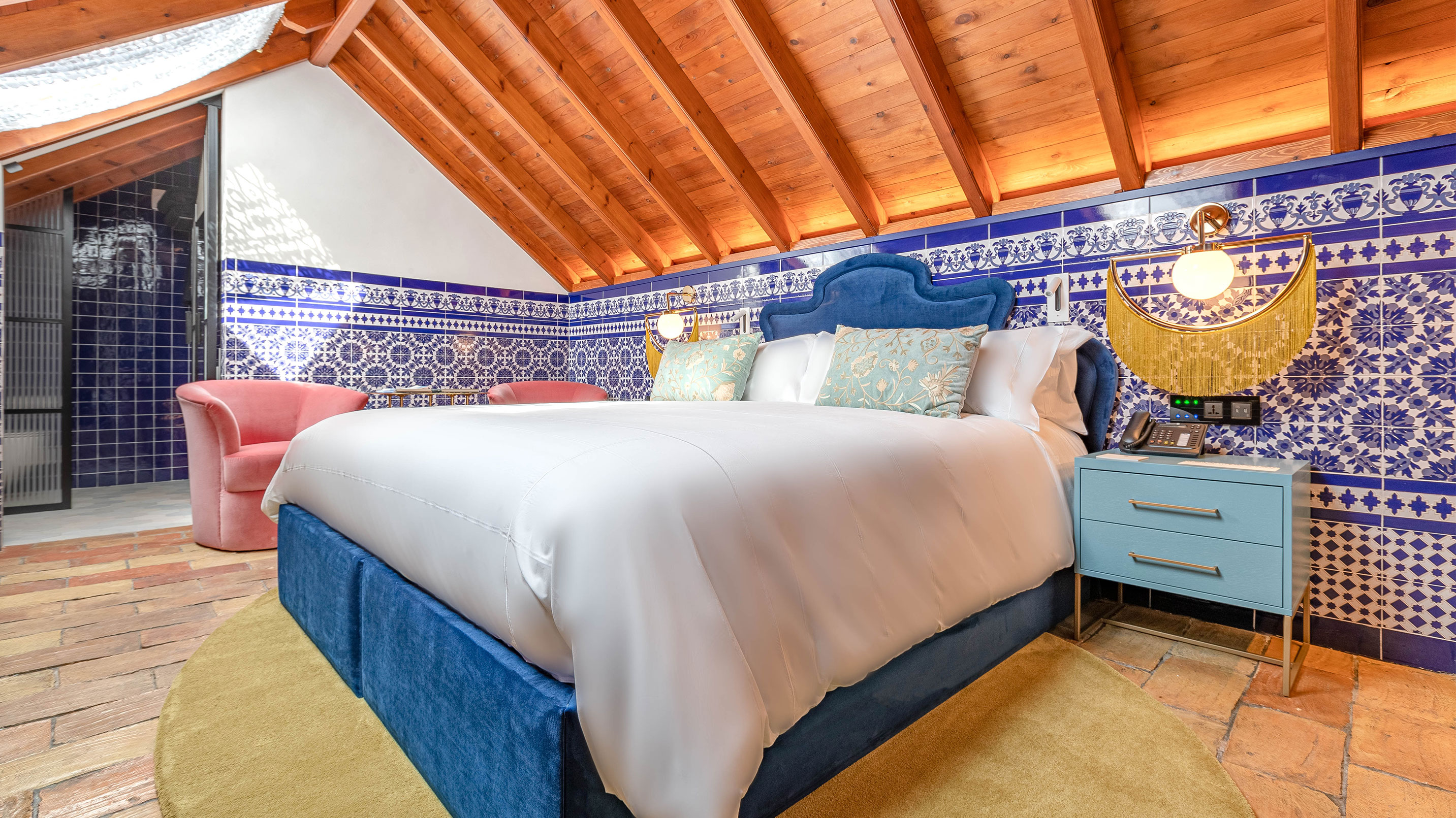 Designed to evoke the rich culture of Seville, the Maestranza guestroom includes traditional blue tiles and a stunning velvet headboard mimicking the shape of the flamenca dancers' hair comb.