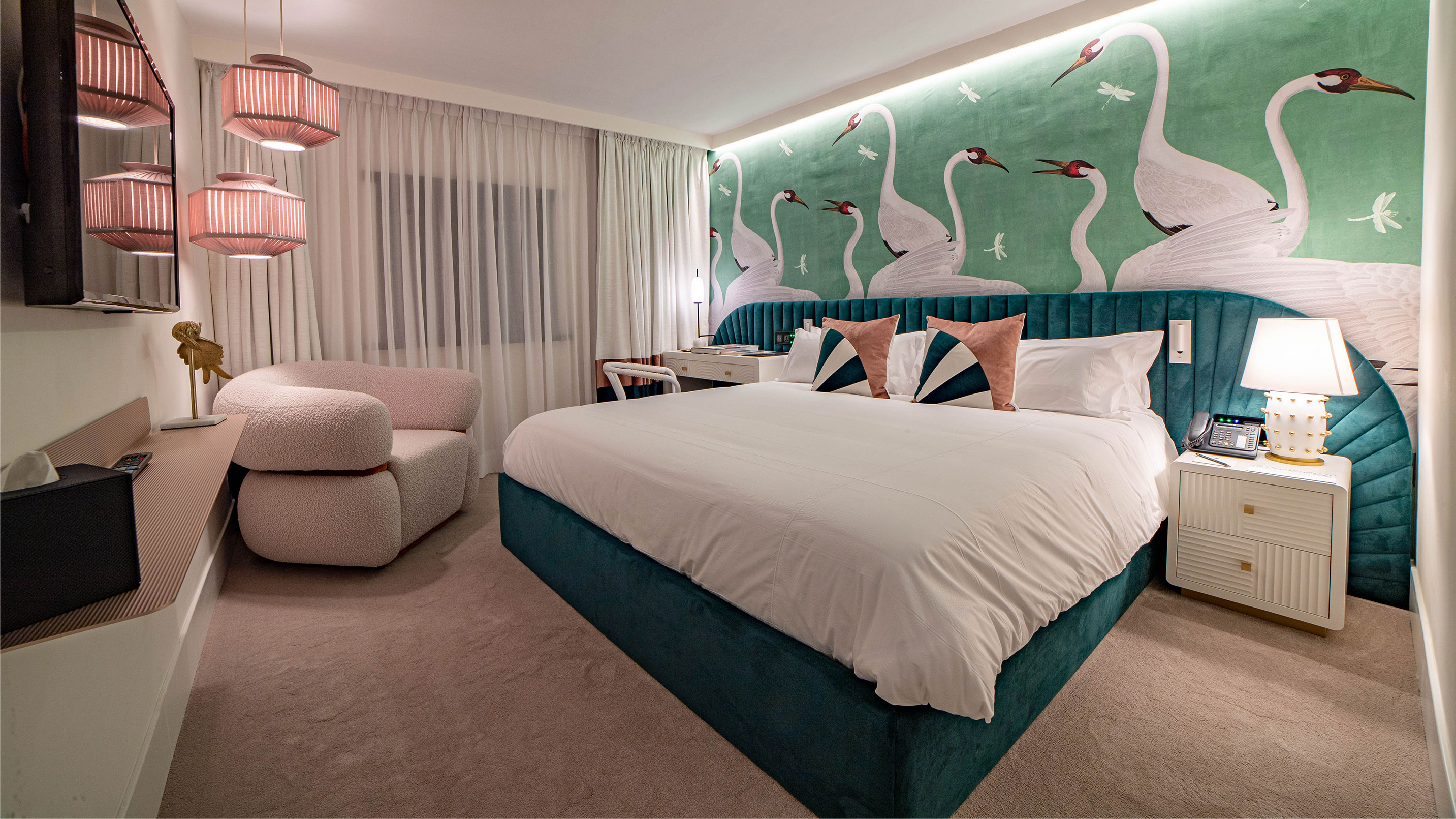 With its glamorous and elegant interior inspired by the unique landscapes of "Marismas de Huelva," the Marismas guestroom transports guests to a sandy beach surrounded by exotic African birds.