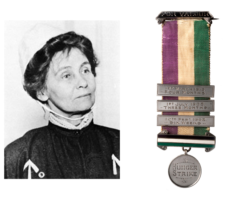 ![]() Left: Emmeline Pankhurst, c. 1908 in prison clothes; Right: Suffragette Hunger Strike Medal |