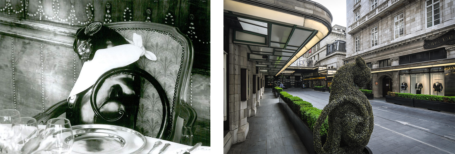 ![]() Image 1: Historical image of Kaspar the cat dining with guests. Image 2: Image of a topiary statue of Kaspar outside the entrance of The Savoy London (courtesy of The Savoy London). |