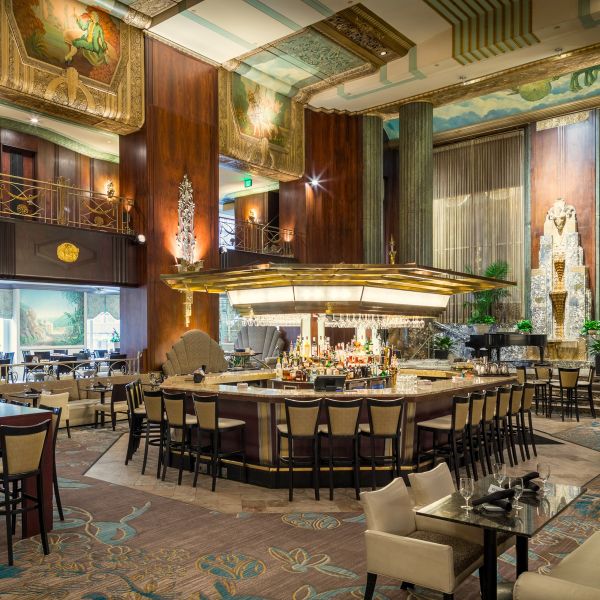 The Lounge at 1931 | Signature Drink: Chef’s Old Fashioned Guests can step into The Lounge at 1931 inside the Hilton Cincinnati Netherland Plaza and experience a stunning tribute to Art Deco-style design, history, and hospitality. The hotel was dry when it opened in 1931 during Prohibition, but it opened with a breathtaking interior that blended French Art Deco-style with Louis XV-style flourishes and theatrical flair. The Lounge at 1931 was introduced during a major renovation in the early 1980s. Surrounding the bar area are original murals painted by Louis Grell, which were completed during the early days of the hotel’s opening. These vibrant works of art illustrate the themes of recreation and imagination, with the distinct outline of the Carew Tower featured in each mural. Visitors will also find other notable Cincinnati landmarks subtly woven into the depicted scenes, reinforcing the hotel’s artistic narrative and celebrating the city’s character. Overhead, the ceiling and portals reflect Egyptian influences with their step pyramid designs, while the ziggurat-shaped fountain at the far end of the Palm Court commands attention with its intricate details: a ram’s head flanked by majestic sea horses wearing lotus crowns. Crafted by the famed Rookwood Pottery studio in the Mount Adams neighborhood of Cincinnati, these design features—alongside dolphins and mermaids woven throughout the space—represent traditional Art Deco-style motifs of protection, youth, and guardianship for travelers. The signature drink at The Lounge at 1931 is the Chef’s Old Fashioned, created using New Riff Single NP Select Bourbon sourced from across the river in Kentucky. The large ice cube contains simple syrup and bitters, so as the ice cube melts, the drink transforms. This signature cocktail is garnished with a twist of orange and an Amarena cherry. Today, the bar remains a timeless destination—where history, design, and hospitality converge into an unforgettable experience for guests. Hilton Cincinnati Netherland Plaza was inducted into Historic Hotels of America in 1991. |