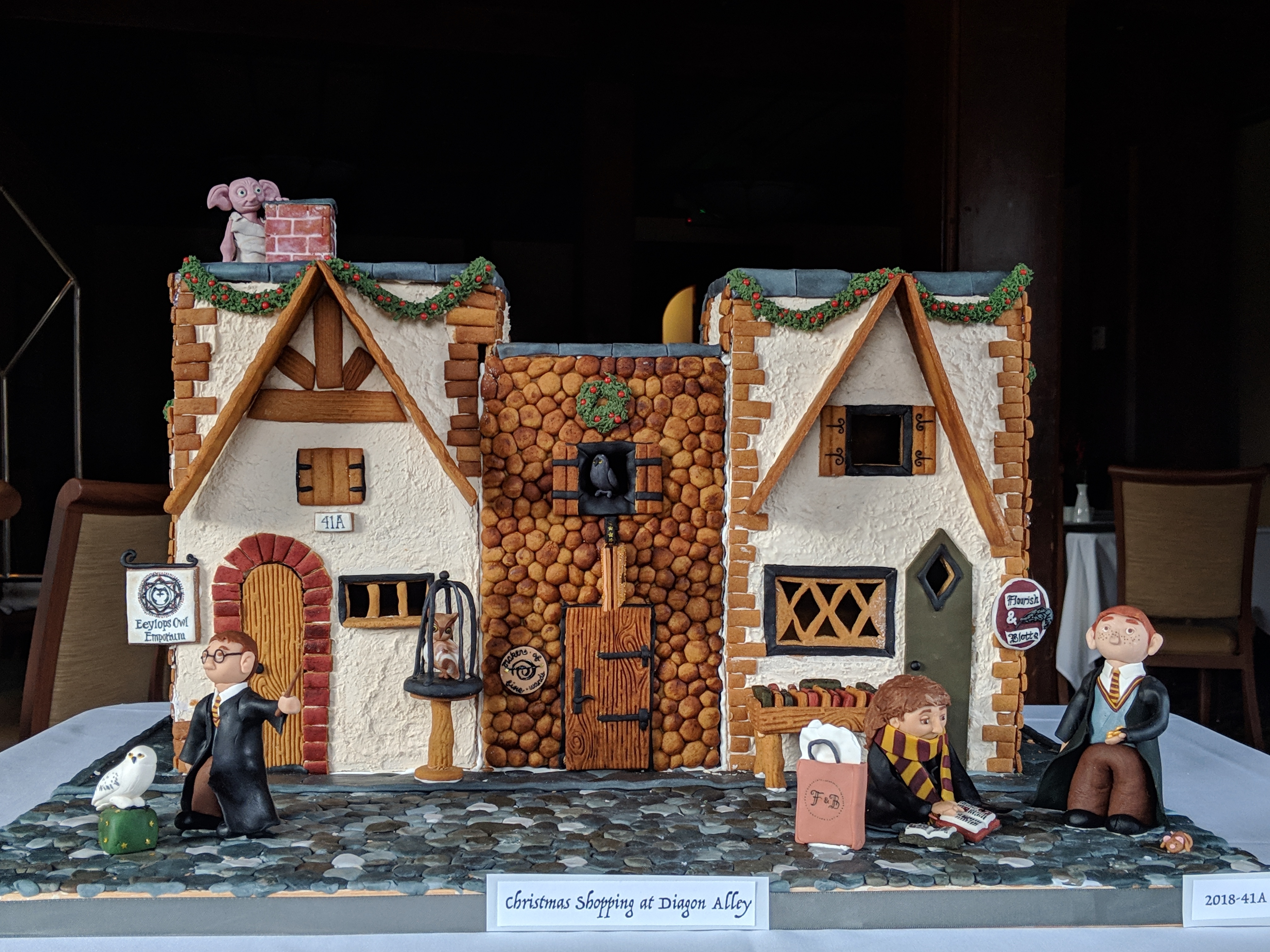 | The Skirvin Hilton Oklahoma City(1911) Oklahoma City, Oklahoma 2019's gingerbread creation took over three days and three five gallon buckets of royal icing, 50 full sheet pans of gingerbread, five pounds of poured sugar work, and over one pound of candy to create. The theme was Victorian homes and it took the pastry team 26 days to make. The gingerbread village was a popular backdrop during the holiday high tea the hotel conducts. |