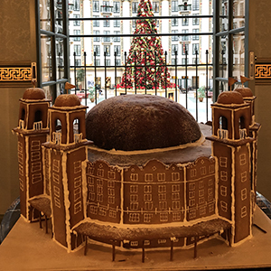 | Palmer House®, a Hilton Hotel (1871) Chicago, Illinois The holidays are about tradition and one of those notable Chicago holiday traditions is the installation of the Palmer House, a Hilton Hotel’s Holiday Hearth at the entrance of the hotel and is on display throughout the holiday season. In 2018, the hotel featured a gingerbread version of this as well. The gingerbread holiday hearth was the creation of Executive Pastry Chef Bouet from Lyons, France, representing over 150 hours of work. The gingerbread creation was composed of 250 pounds of freshly made gingerbread, 20 pounds of royal icing and 90 pounds of Belgian Chocolate. |