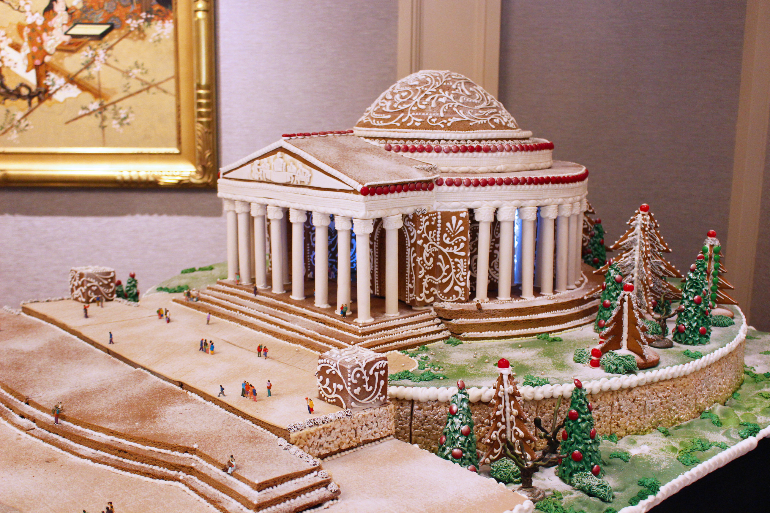 | The Willard InterContinental (1818) Washington, DC The Willard’s 2019 gingerbread display was of the Jefferson Memorial, including The Tidal Basin and D.C.’s iconic cherry blossom trees in an effort to bring awareness to the hotel’s campaign and the ongoing efforts needed to preserve the Tidal Basin, named one of America’s 11 Most Endangered Historic Places by the National Trust for Historic Preservation. Standing at eight and a half feet by five feet, The Willard’s gingerbread display featured a southeast view of the famed Jefferson Memorial, and include the famed bronze statue of Jefferson by Rudulph Evans and all four quotations from Jefferson's writings that are carved into the walls of the actual memorial. The display also included an audio feed of Thomas Jefferson’s Inaugural Addresses, as well as a real water component to simulate the Tidal Basin complete with live fish. Intricate chocolate techniques, along with the use of fondant, brought the famed cherry blossom trees surrounding the memorial to life. |