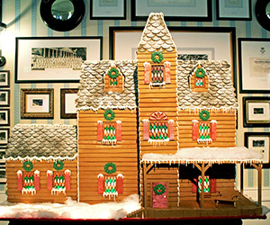 | Woodstock Inn & Resort (1793) Woodstock, Vermont It took four people from the resort’s pastry department to create and implement the gingerbread creation for this resort. The bakers started at the beginning of November working on the shingles and the setup was completed the first week of December. The bakers had help from the Inn’s carpenters to create a wooden structure and then the pastry team placed the shingles onto the wood, and after that the decorating commenced. The theme for the gingerbread creation was Dr. Seuss and was five feet long, four feet wide and six foot tall. Ingredients used include: 150 pounds of flour, 51 pounds of molasses, 40 pounds of shortening, six pounds of ginger, six pounds of cinnamon, two pounds of baking powder, one pound of salt, a ton of eggs, and adorned with 15 pounds of candy. |