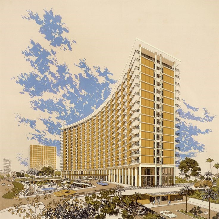 VIEW TIMELINEIn 1961, real estate developer William Zeckendorf and ALCOA purchased nearly 180 acres from 20th Century Fox in downtown Los Angeles. (The studio had downsized amid a number of box-office flops that culminated with the film Cleopatra, at the time the most expensive movie ever made.) Zeckendorf and ALCOA then started to create a magnificent district known as “Century City.” While many upscale apartments and storefronts were planned to proliferate throughout the neighborhood, the two intended for an opulent boutique hotel to serve as its primary attraction. Named as the “Century Plaza Hotel,” work on the building began under the supervision of renowned architect Minoru Yamasaki. (Yamasaki designed many outstanding structures throughout his lifetime, including the plans for the original World Trade Center.) He proceeded to create a gorgeous building over the next several years that gradually dominated the local skyline. One of the world’s best Mid-Century Modern buildings, the Century Plaza Hotel stood 19 stories tall and featured 750 spectacular accommodations. Perhaps the structure’s most defining element was its unique arch, which made it resemble something like a crescent moon. Inside, Yamasaki created many fantastic public spaces, such as a spectacular lobby and an ornate grand ballroom. The guestrooms also contained some of the finest amenities of the age, like electric blankets, ice machines, and radios installed directly into the nightstands. The Century Plaza Hotel was even the first to offer color televisions—something that most American residences would not have for another decade!