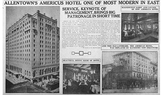 VIEW TIMELINEListed in the U.S. National Register of Historic Places, the Historic Americus Hotel is one of Pennsylvania’s most celebrated destinations. The hotel is located in the heart of Allentown, where it has stood as a cherished landmark for generations. This iconic historic hotel originally debuted at the height of the Roaring Twenties, where it functioned as the center of all social life in the community. Albert D. Gomery was the person responsible for deciding to create the building, forming the “American Hotel Realty Co.” to oversee the project alongside his brother and a few other entrepreneurs. Through the business, Gomery and his colleagues proceeded to purchase the lot of another historic destination—the American Hotel—and cleared it to lay a completely new foundation. The businessmen then awarded the design contract to Ritter and Shay, a prominent Philadelphia-based architecture firm that had created many renowned structures noted for their Chicago Commercial-style appearances. Ritter and Shay proceeded to develop a magnificent edifice that showcased a brilliant blend of Mediterranean design motifs. The implementation of such design elements reflected the desire of Gomery to utilize the nascent building as a metaphor for American growth and prosperity. As such, the architecture specifically acted as an overture to the mariners that first sailed to the Americas during the Age of Discovery. But the building’s very layout featured a variety of unique concepts, too, particularly in regard to the arrangement of the ground floor. Ritter and Shay specifically established a series of innovative bays next to the lobby that allowed for a ring of upscale shops to open. Even the structure’s initial slate of guestrooms featured a ingenious format that offered a better flow of natural light.