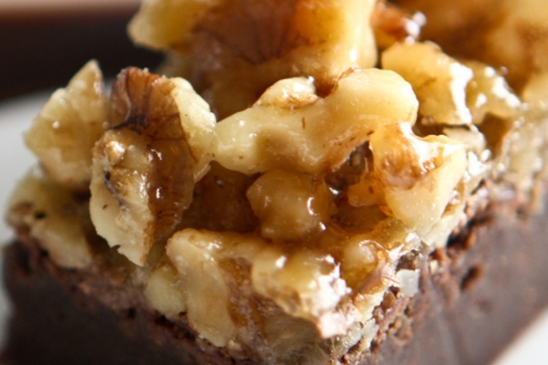 3. Pour the mixture into a 9x12 baking sheet. Sprinkle walnuts on top, pressing down slightly into the mixture with your hand. Bake for approximately 35 minutes.