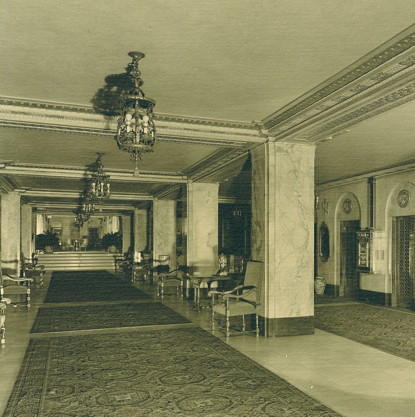 Five brilliant metal entrance foyers resided on the ground level, which displayed their own unique set of Italian-inspired travertine. Ahlschlager led each entryway directly into the hotel’s ornate lobby and its beautiful polychrome wood-beamed ceiling and colorful glass skylights. Terrazzo marble flooring proliferated throughout the space, graced by the presence of 16 marvelous square columns. The columns themselves were incredibly gorgeous, as Ahlschlager faced each one with rose St. Genevieve marble. A fountain dominated the center of the lobby that Italian artisans carved from a single block of white travertine marble. Its bowl also featured four cupids sitting astride dolphins, surrounded by a low octagonal curb of black and gold stonework. Many more outstanding facilities were located directly off of the lobby, too, such as the two-story Tea Room, the Continental Ballroom, and two magnificent dining spaces—the Venetian and Georgian rooms. Ahlschlager even designed every single one of the new 625 guestrooms to contain nothing but the finest amenities of the age.