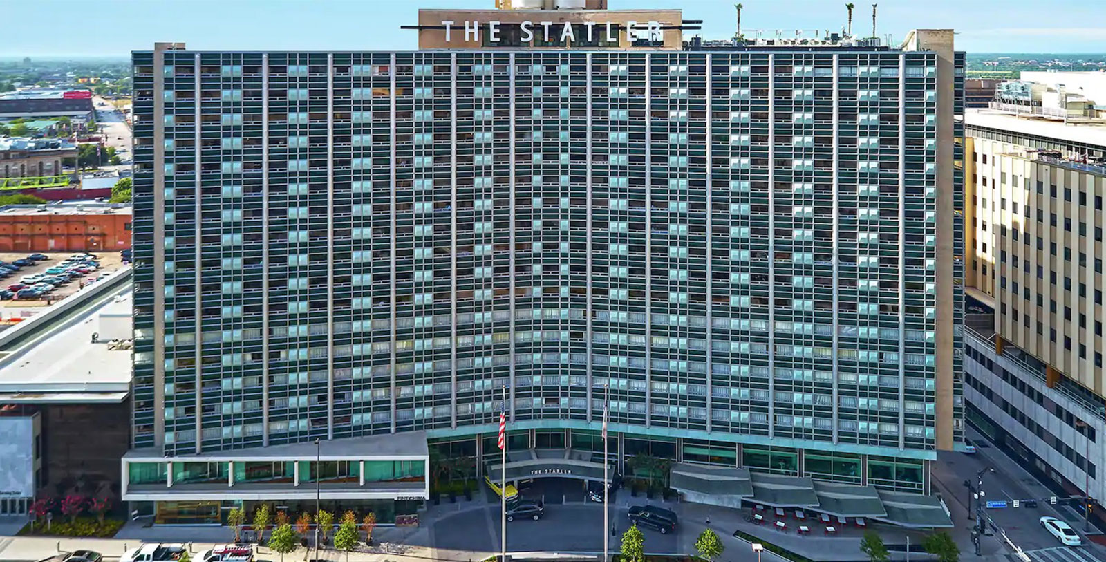 Heralded as America’s first modern hotel, The Statler Dallas, Curio Collection by Hilton opened in January 1956. It boasted a cantilever architectural style that allowed for a decorative glass and porcelain exterior curtain wall in classic Midcentury modern teals and vast open interior spaces. Amongst other countless progressive features, The Statler Dallas, Curio Collection by Hilton was the first building to ever have elevator music and offered separate elevator banks for service and guests. This hotel catered to business while offering entertainment seamlessly. It was the largest convention hotel in the southwestern United States but also had a Grand Ballroom and fine-dining supper club that hosted many famous acts, including Tony Bennet, Liberace, and the Jackson 5.