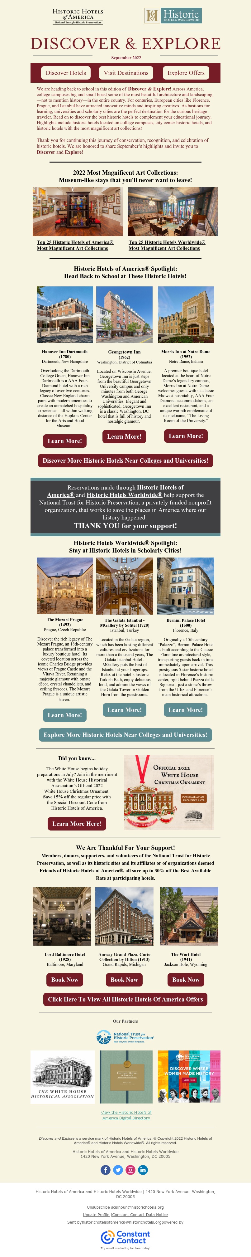 September 2022: Head Back to School With Historic Hotels on College Campuses and in City Centers!